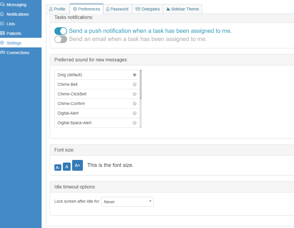 Preferences tab: you can manage notifications, sounds for messages, font size and idle timeout options.