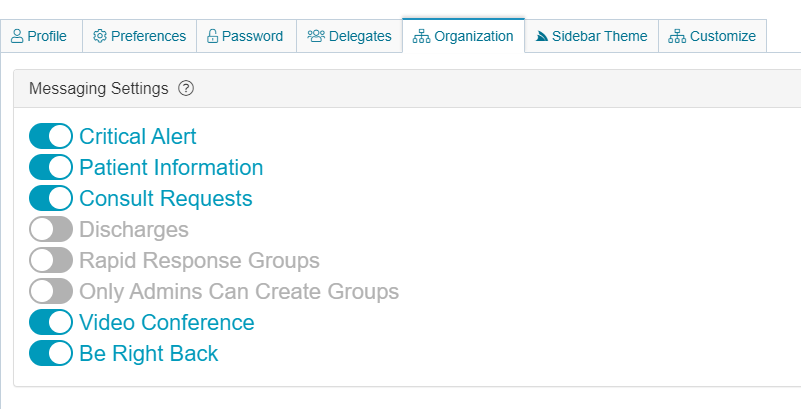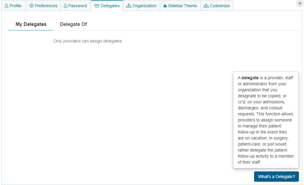 Delegates tab: Delegates can only be assigned by providers. A delegate is a provider, staff or administrator from your organization that you designate to be copied, or cc'd, on your admissions, discharges, and consult requests. This function allows providers to assign someone to manage their patient follow-up in the event they are on vacation, in surgery, patient-care, or just would rather delegate the patient follow-up activity to a member of their staff.