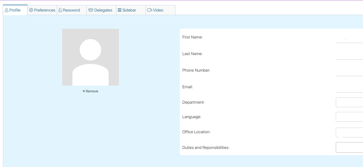 Select Profile tab: to update First Name, Last Name, Phone Number, Department, Language, Office Location and Duties and Responsibilities